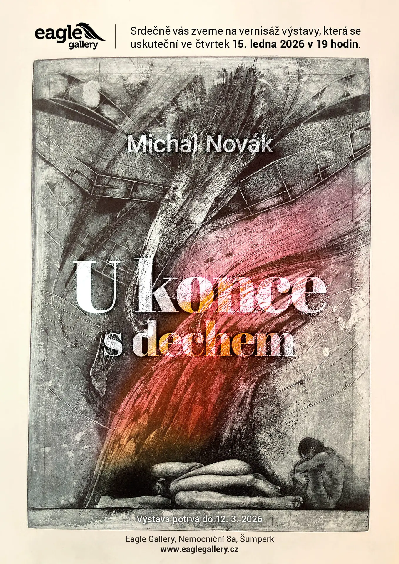 Slavnostně zakončíme první letošní výstavu „U konce s dechem“ výtvarníka Michala Nováka. Dernisáž se uskuteční ve čtvrtek 12.března v 19 hodinEagle Gallery, Kabinetu grafiky na Nemocniční ulici č. 8a v Šumperku. Naposledy můžete přijít obdivovat jak volnou grafiku a exlibris, tak i kresby a malby, a to za účasti autora.